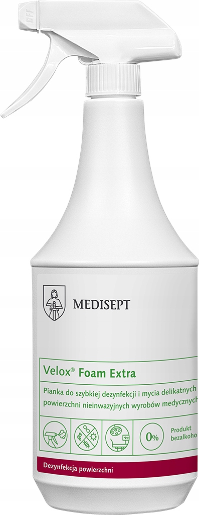 Zastosowanie: Pianka Velox® Foam Extra zalecana jest do dezynfekcji różnorodnych powierzchni nieinwazyjnych wyrobów medycznych ze szkła, porcelany, metalu, gumy, tworzyw sztucznych oraz szkła akrylowego. Może być stosowana na oddziale intensywnej opieki medycznej oraz bloku operacyjnym, do dezynfekcji aparatury medycznej, sprzętu rehabilitacyjnego, foteli zabiegowych, inkubatorów i lamp zabiegowych. Nie zawiera aldehydów i fosforanów, dzięki czemu nie odbarwia dezynfekowanych powierzchni. Posiada przyjemny zapach. Produkt posiada pozytywną opinię Centrum Zdrowia Dziecka nr 43/DKJ/2016.