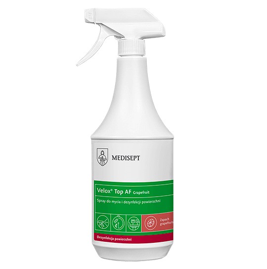 Medisept, płyn do mycia i dezynfekcji powierzchni Velox Top AF Grapefruit to gotowy do użycia preparat wykazujący działanie biobójcze przeciwko bakteriom, grzybom, prątkom i wirusom. Jest wyrobem na bazie alkoholu. Nie zawiera aldehydu i fenolu, dlatego nie odbarwia dezynfekowanych powierzchni. Wykazuje wysoką tolerancję materiałową na tworzywo ABS i materiały obiciowe.