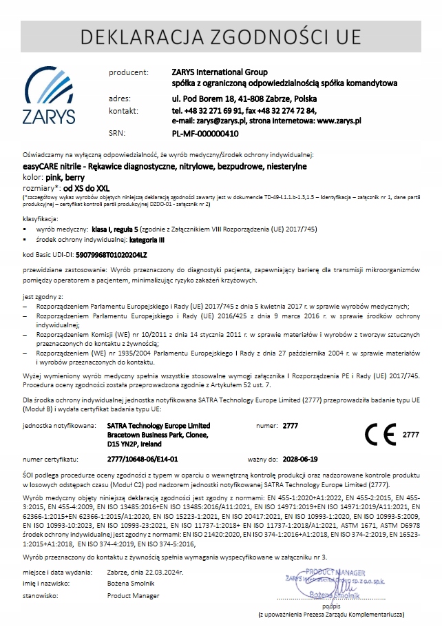 Wyżej wymieniony wyrób medyczny spełnia wszystkie stosowalne wymogi załącznika I Rozporządzenia PE i Rady (UE) 2017/745.